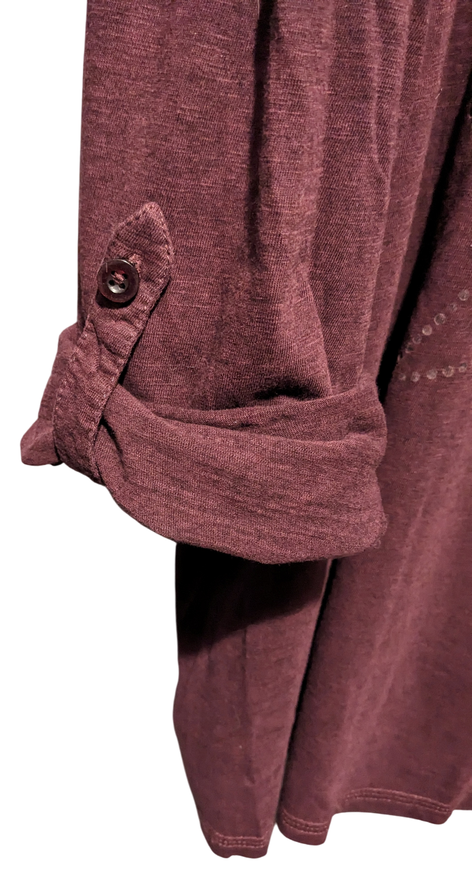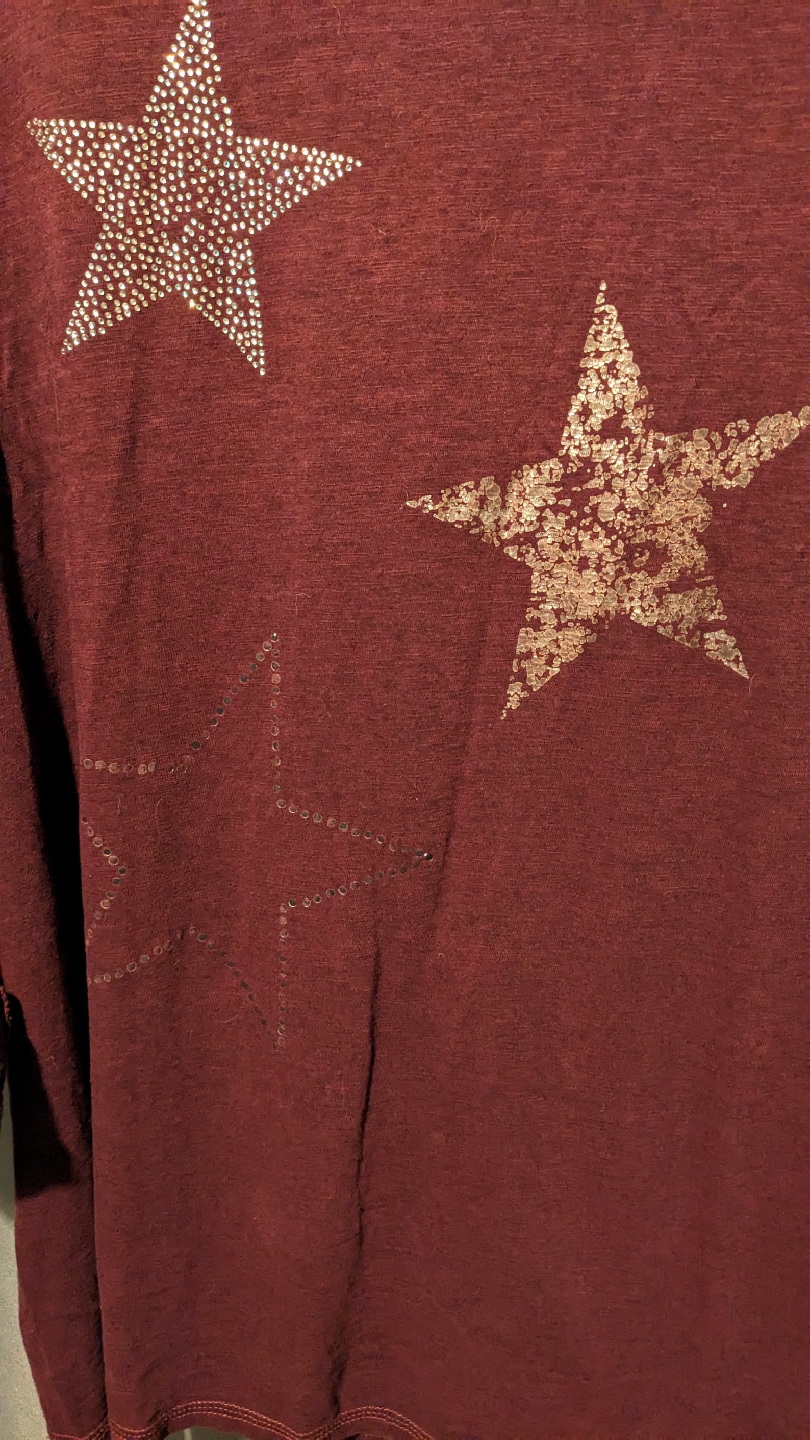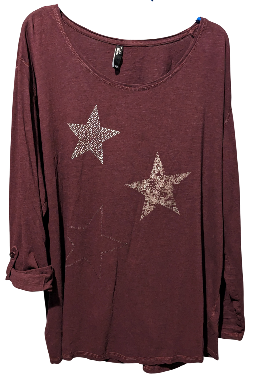 Das bordeauxrote Damen-Langarmshirt der Marke Maxi Blue zeichnet sich durch ein auffälliges Sterne-Design auf der Vorderseite aus. Es hat einen weiten Rundhalsausschnitt und krempelbare Ärmel, die mit einem Knopf fixiert werden können.