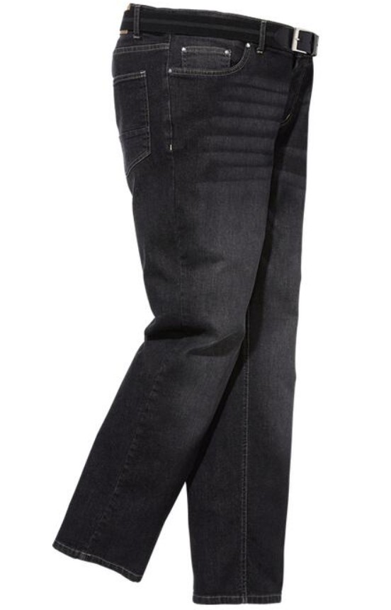 Kernige Jeans für starke Kerle mit speziellem Unterbauchschnitt. Der Bund sitzt vorne tiefer und hinten höher als bei gewöhnlichen Jeans – für bequemen Sitz unter dem Bauch mit optimaler Bewegungsfreiheit. Mit rotem Rauten-Innenfutter und passendem Gürtel im Lieferumfang enthalten.