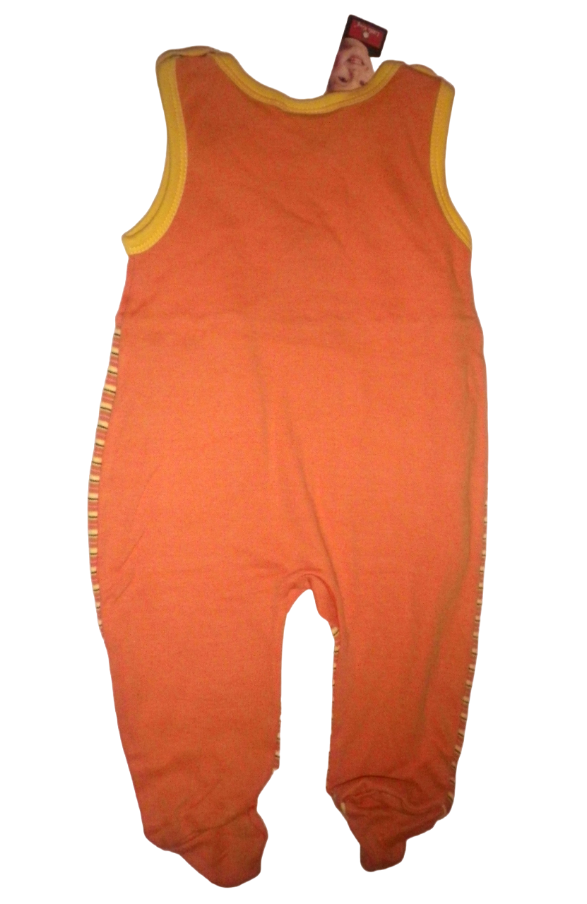 Hochwertiger Strampler mit niedlichem Giraffenmuster in Orange und Gelb. Ausgestattet mit zwei aufgesetzten Taschen für praktischen Stauraum.