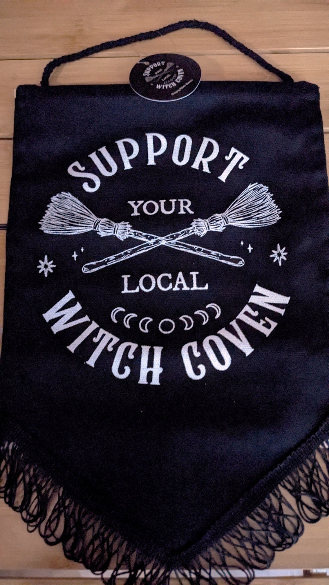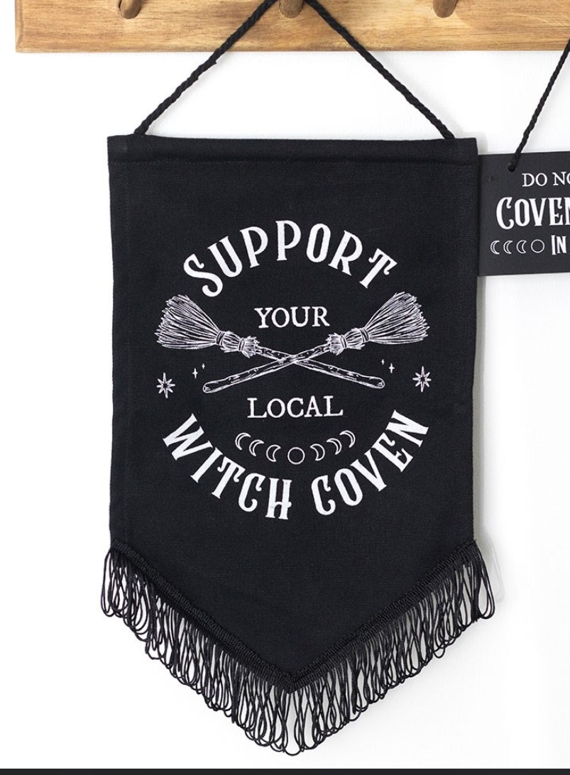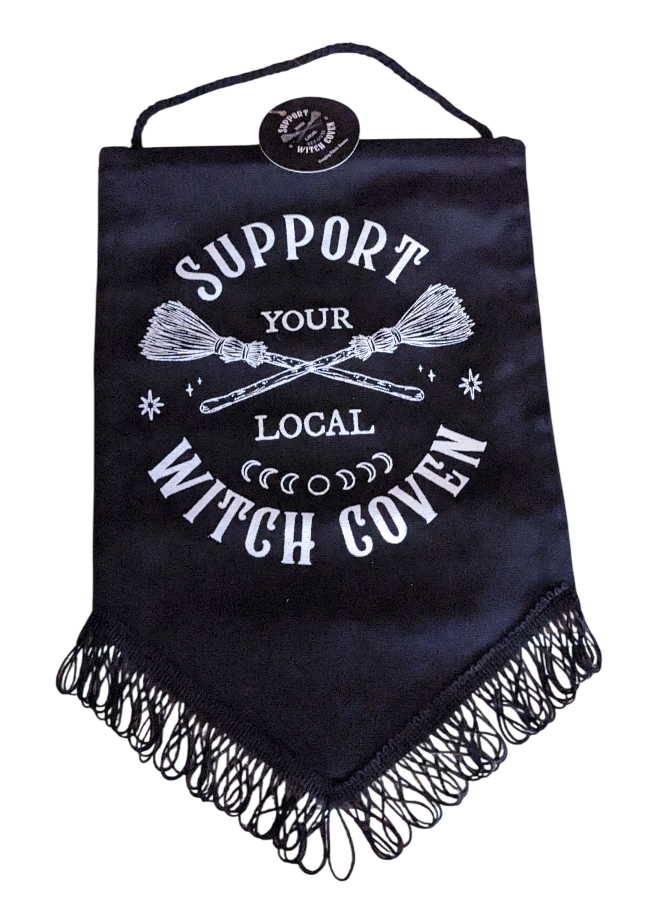 Ein Statement ist dieser Tischwimpel Gothic-Hänge-Banner mit dem Satz "Support Your Local Witch Coven" neben einem gekreuzten Besen. Perfekt für die Dekoration von Stammtischen , Altären, Wänden oder Fenstern, es ist ein lustiges Stück für Hexen, Praktizierende oder Liebhaber aller magischen Dinge.