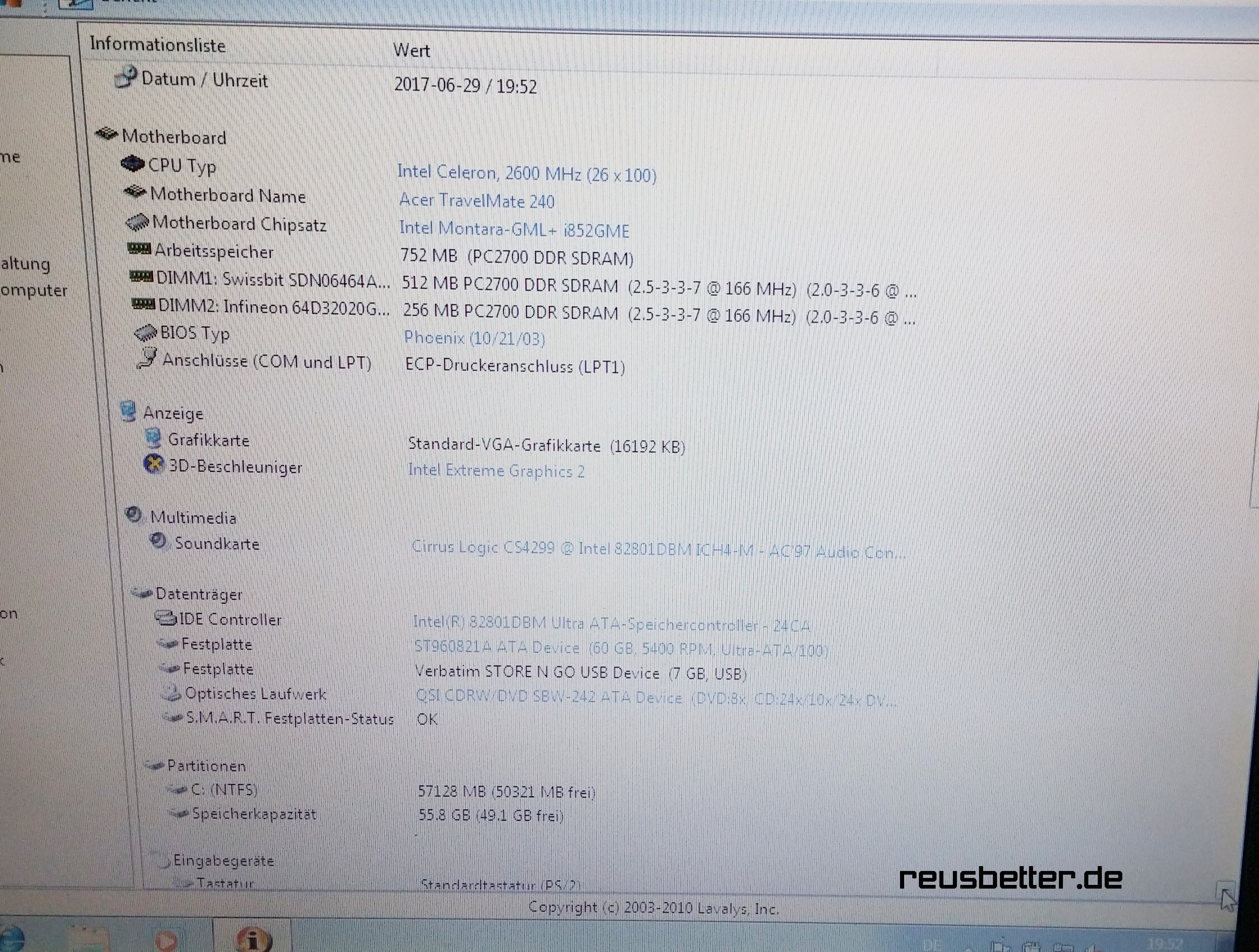 CPU: Intel Celeron, 2.60GHz • RAM: 752 MB DDR • HDD: 60 GB • SSD: N/A • Optisches Laufwerk: DVD-CDRW, Floppy • Grafik: 64MB Intel DVMT Shared • Display: 15", 1024x768 • Anschlüsse: 4x USB-A 2.0, 1x LAN, RJ-11 • Betriebssystem: Windows XP Home • Gewicht: 3.36kg • Besonderheiten: Analog-Modem