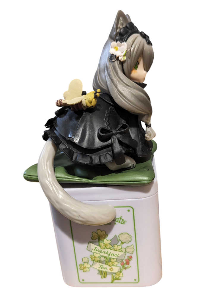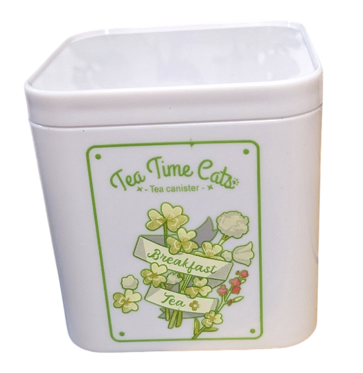 Tea Time Cats sitzend auf einem Kissen und Tee Dose in weiß aus PVC zum öffnen für Tee incl Verpackung.