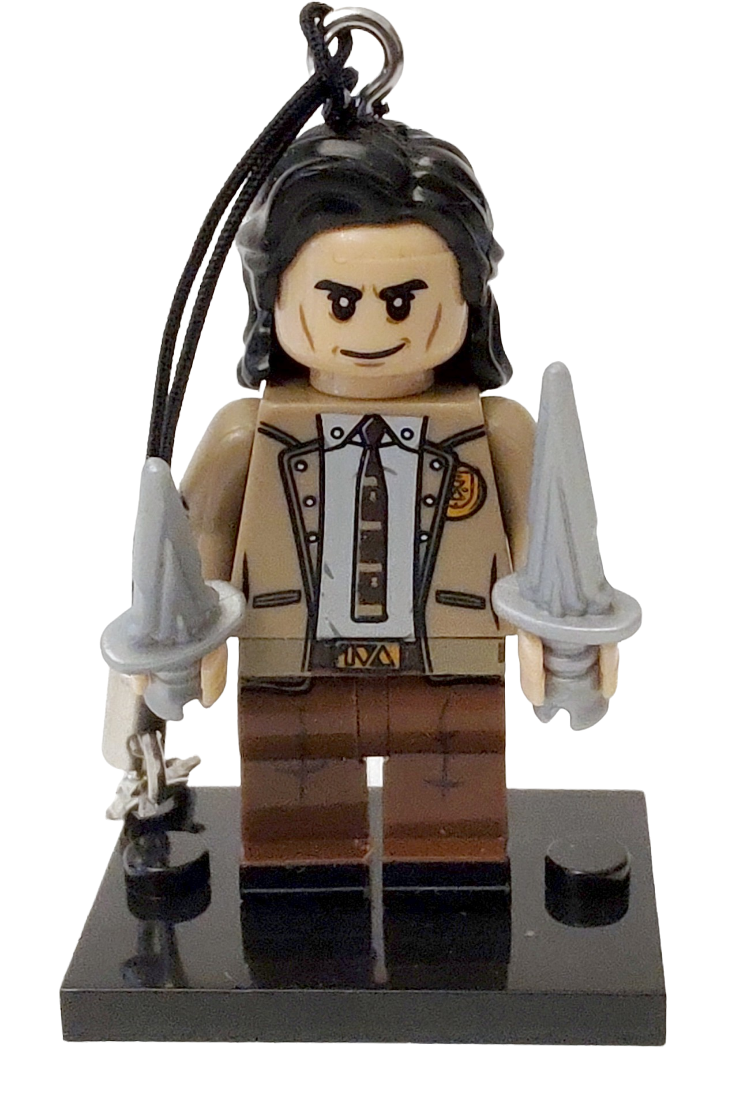 Loki im Lego Styl mit TVA Anzug und 2 Dolchen mit Anhänger für Taschen, Handys und Schlüssel und vieles mehr