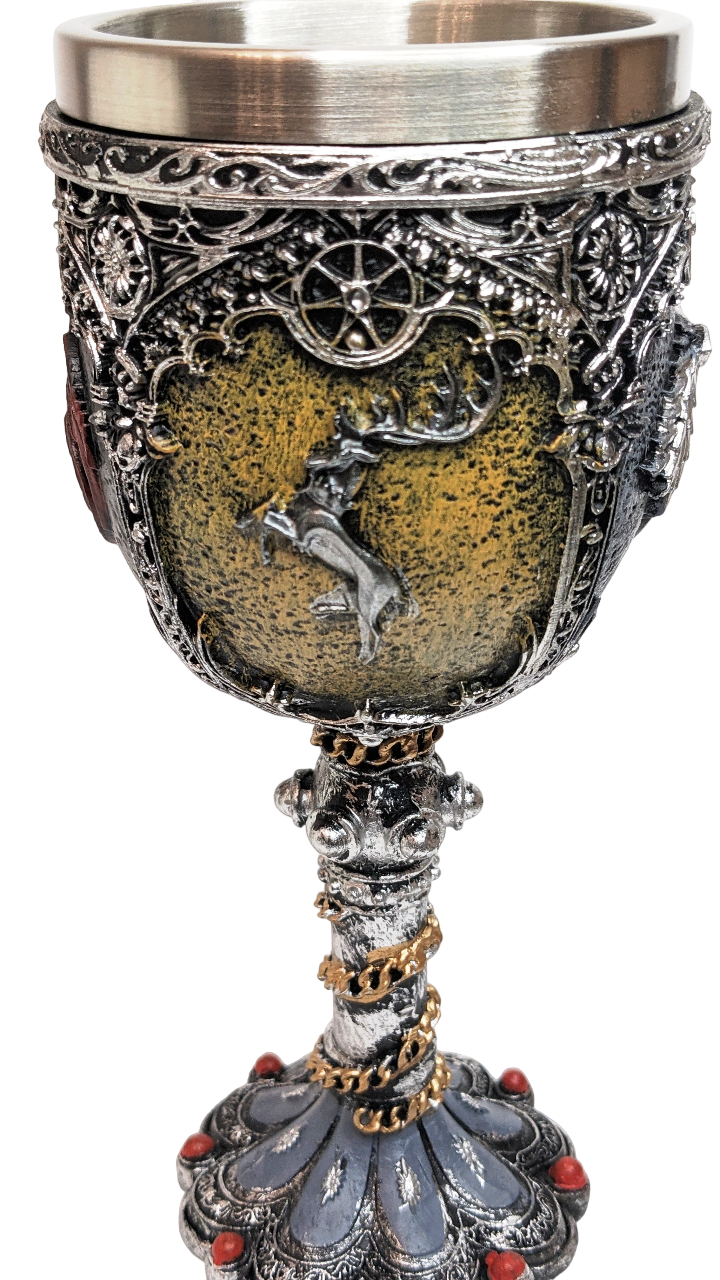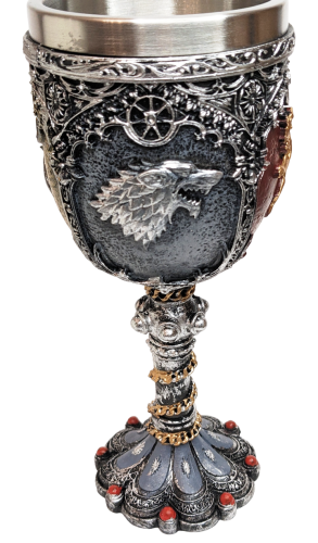 Prunkvoller Weinkelch mit 4 Wappen der Häuser: Haus Stark, Haus Targaryen, Haus Lannister und Haus Baratheon von Game of Thrones in 3D abgebildet.