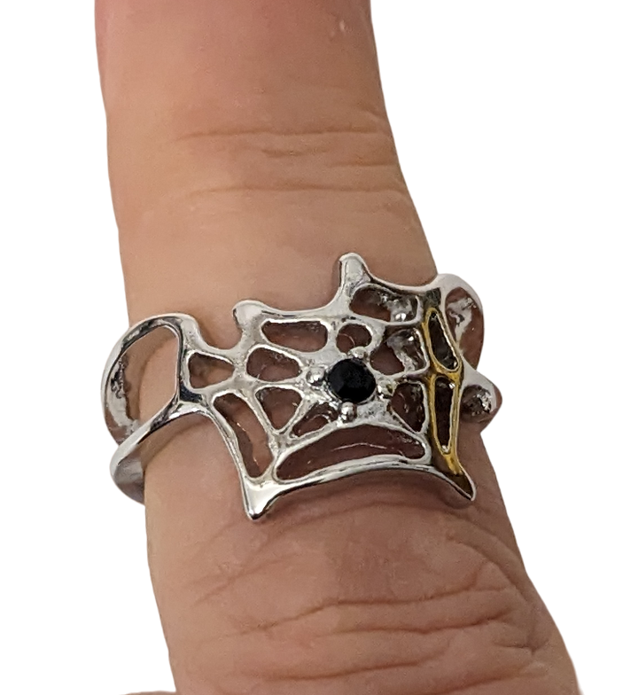 Eleganter Spinnennetzring aus Zink-Legierung mit kleinem schwarzem Facettenschliff-Stein. Der verstellbare Ring bietet universelle Größenanpassung und ist perfekt für Industrial Style, Gothic und Steampunk Liebhaber.