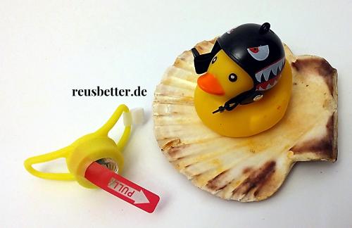 Es gibt aber keine Quietscheentchen mehr, die wirklich laut und deutlich quietschen. Das liegt an den EU-Richtlinien für Kindersicherheit. Diese bestimmen, dass die Quietschedüse fest mit der Ente verbunden sein muss (worauf die Hersteller meist aus Kostengründen dann verzichten) bzw. wenn sie denn eingebaut wird, dann ist diese geräuschreduziert. Geräuschreduziert deshalb, weil Kinderspielzeug einen bestimmten Grenzwert nicht überschreiten darf.