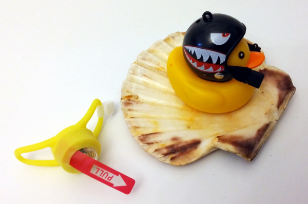 4 Teile Set bestehend aus: 1 Entchen, 1 Helm, 1 Gummihalterung, 1 Licht incl. 2 Knopfzellen 2032 auf der Unterseite zu öffnen. Einfach auf das Entchen drücken damit das Licht Angeht. 2 Verschiedene Einstellungen einmal Blinklicht und einmal Standlicht. Mit der Öse am Helm auch als Anhänger verwendbar oder auch nur zum Hinstellen.